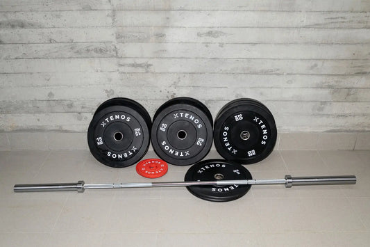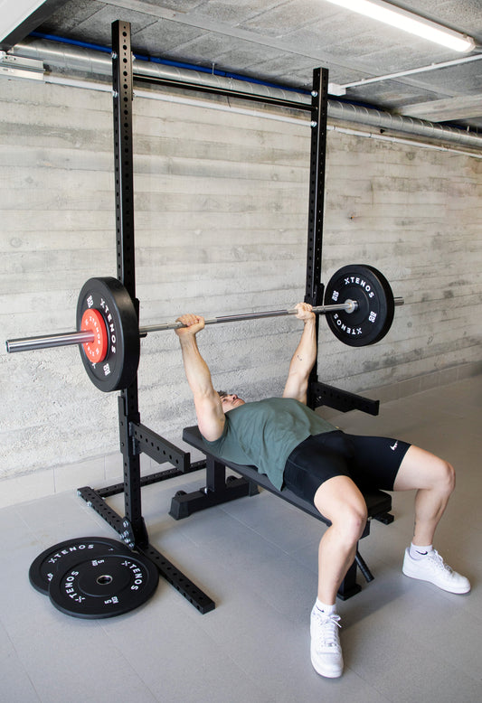 Squat Stand ATLAS + Barras de seguridad + Banco plano + Discos de peso (105Kg) + Cierres + Barra Olímpica (20Kg)